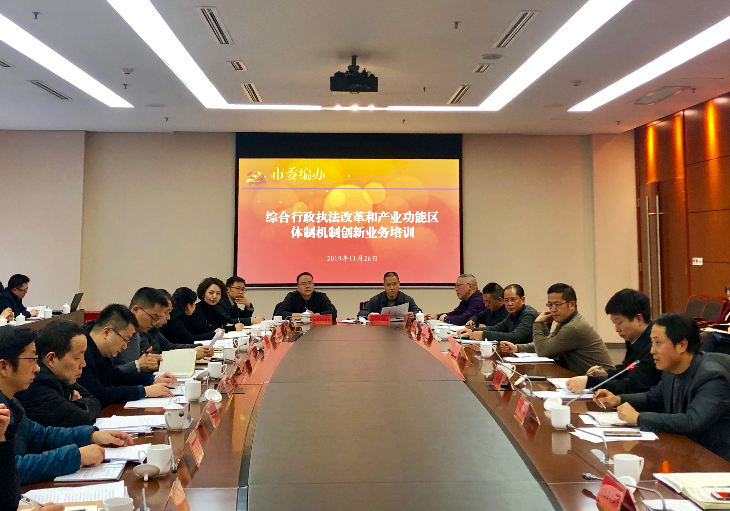为贯彻落实党的十九届四中全会精神,深入推进重点领域行政体制改革和体制机制创新,11月26日,市委编办举办综合行政执法改革和产业功能区体制机制创新业务培训,市委组织部副部长、市委编办主任敬斌出席并讲话,市委编办副主任谭英华主持本次培训。